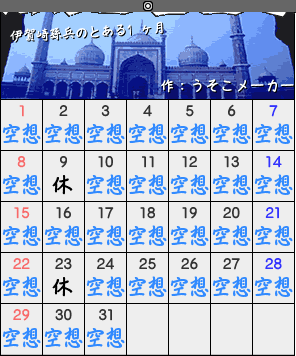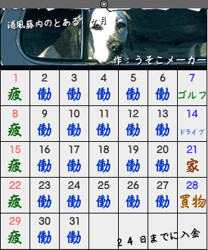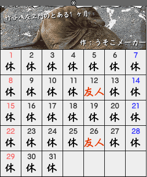 うそこメーカー様のカレンダーメーカーで。 夢見がちな孫兵可愛過ぎる…! 藤内はまさにこんなイメージです。マジメっ子!日曜の疲がリアル。(笑) 竹谷先輩はとてもフリーダム!うらやましい一ヶ月だ…。